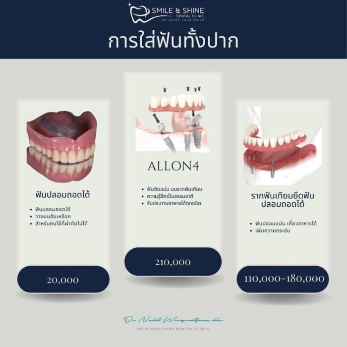 | เหมาะกับ | เน้นประหยัด / สุขภาพไม่พร้อมผ่าตัด | อยากแน่นขึ้น แต่ยังอยากถอดล้างได้ | ต้องการฟันติดแน่นจริงจัง / เคี้ยวหนัก |